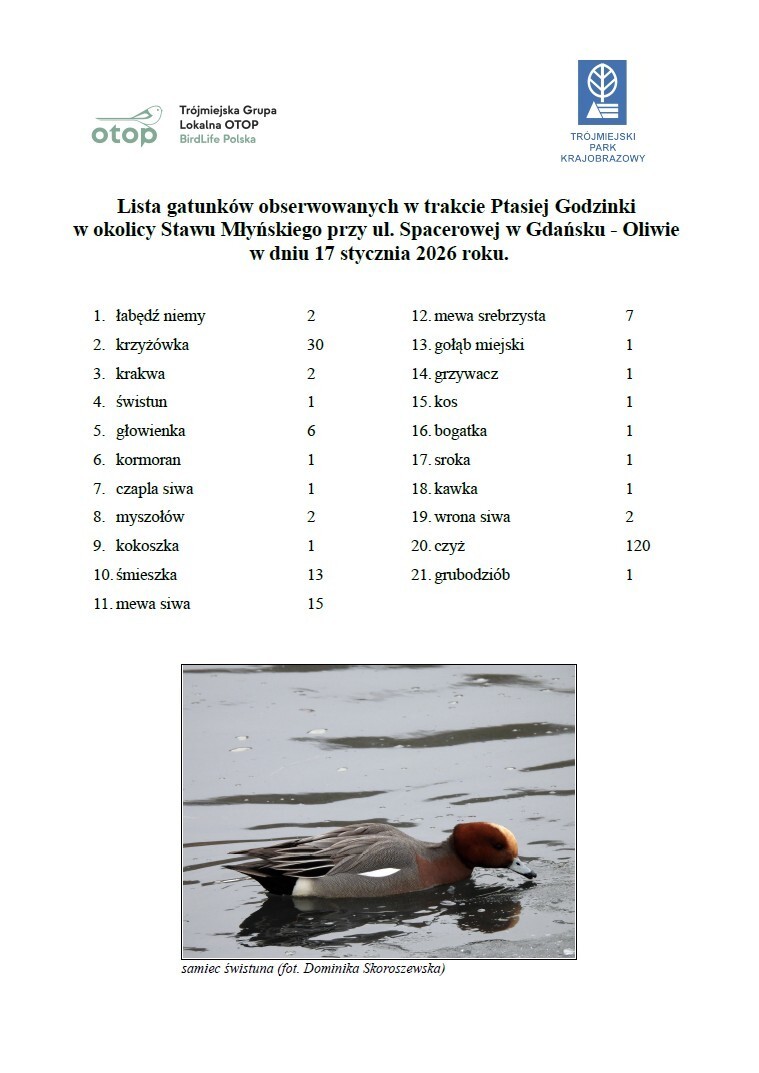 Trójmiejski Park Krajobrazowy oraz Trójmiejska Grupa Lokalna OTOP wspólnie zorganizowali „Ptasią godzinkę” w Gdańsku-Oliwie, czyli liczenie ptaków w ramach międzynarodowej akcji, której polskim partnerem jest Ogólnopolskie Towarzystwo Ochrony Ptaków (OTOP). Pierwsze liczenie w naszym kraju odbyło się w dniach 16-18 stycznia 2026 r.